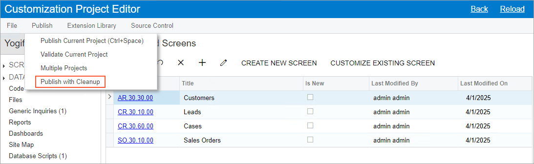 Figure 2. Publishing of a customization project with the cleanup operation