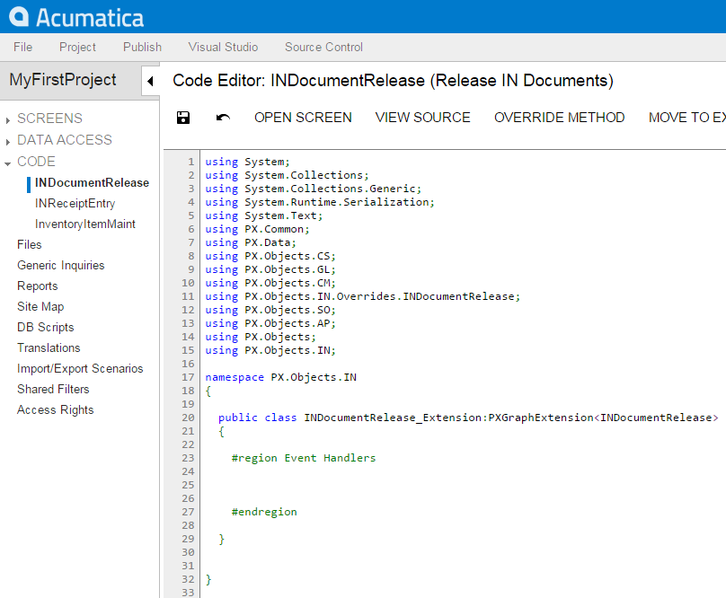 The Code Editor opens for customization of the business logic code of the form (see the screenshot below). The system generates the BLC extension class in which you can develop the customization code. (See Graph Extensions for details.)