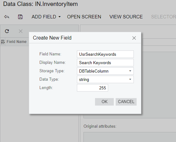 As soon as you move the focus out of the Field Name box, the system adds the Usr prefix to the field name (see the screenshot below), which provides the distinction between the base fields and new custom fields that you add to the class. Keep the prefix in the field name and click OK to add the data field to the class.