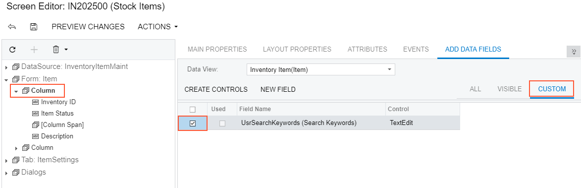 Suppose that you have to add an input UI text box for a bound data field to the Stock Items (IN202500) form. To do this, you have to: