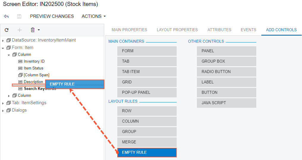PXLayoutRulecomponent right above the control and configure it as follows:- Select the Add Controls tab of the Screen Editor and drag and