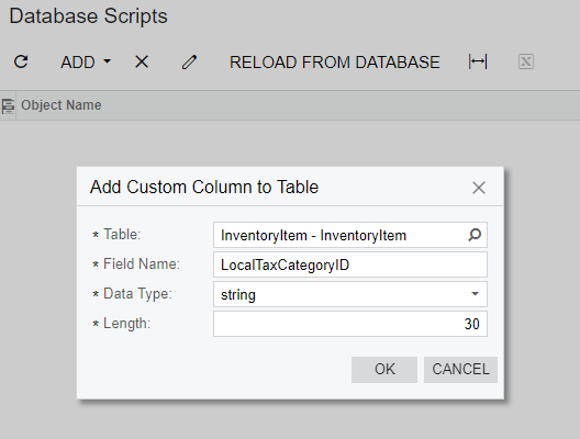 InventoryItemdata access class, and adds the Table item for adding the corresponding column to the database table. - Click Save on the toolbar of the Data Class Editor to save the changes to the project. After you save the added field, you can see the added project item in the Database Scripts page of the Customization Project Editor.