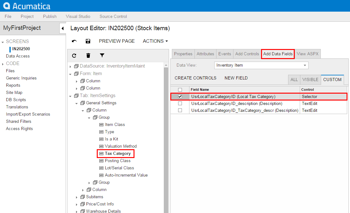 usrLocalTaxCategoryIDdata field in the DAC extension class, as listed below.using PX.Data; using PX.Objects.IN; using PX.Objects.TX; namespace PX.Objects.IN { public class InventoryItemExtension: PXCacheExtension<InventoryItem> { #region UsrLocalTaxCategoryID public abstract class usrLocalTaxCategoryID : PX.Data.IBqlField { } [PXDBString(10, IsUnicode = true)] [PXUIField(DisplayName = "Local Tax Category")] [PXSelector(typeof(TaxCategory.taxCategoryID), DescriptionField = typeof(TaxCategory.descr))] public string UsrLocalTaxCategoryID { get; set; } #endregion } }Tip: In this example, the .cs file with the DAC extension code is added to the customization project as a custom Code item. When you develop extensions in custom Code items, define the extension classes in the namespace of the original class. For more information about adding custom Code items to the project, see Code. - Update the customization project with the new customization code. To do this, open the