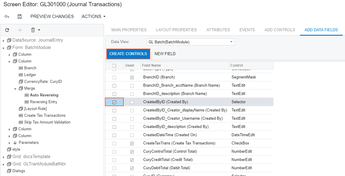 To open the Screen Editor, open the Journal Transactions (GL301000) form, click the