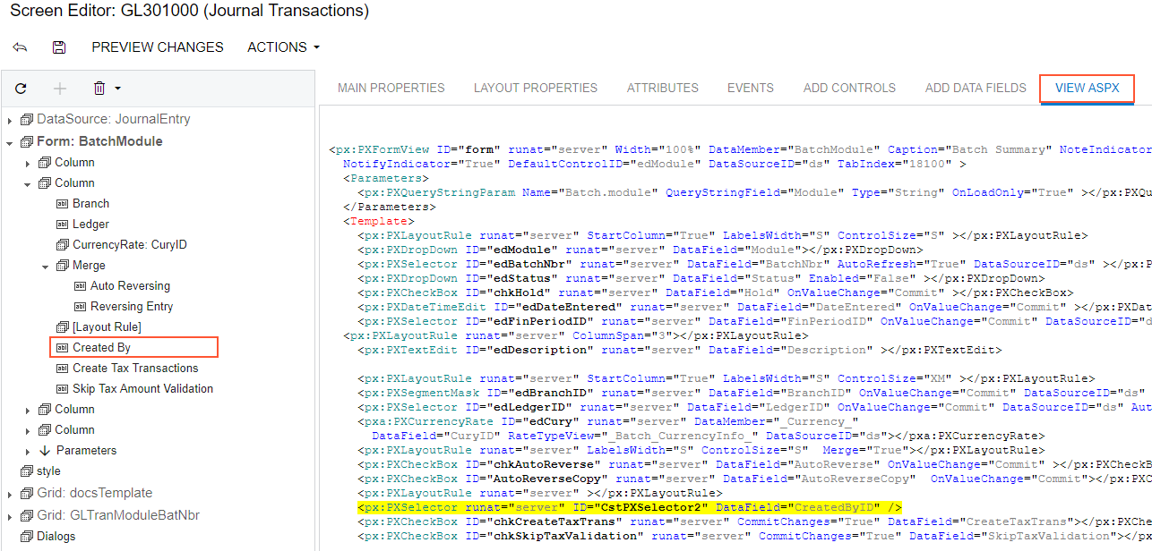 in the Screen Editor and select the View ASPX tab. The customized