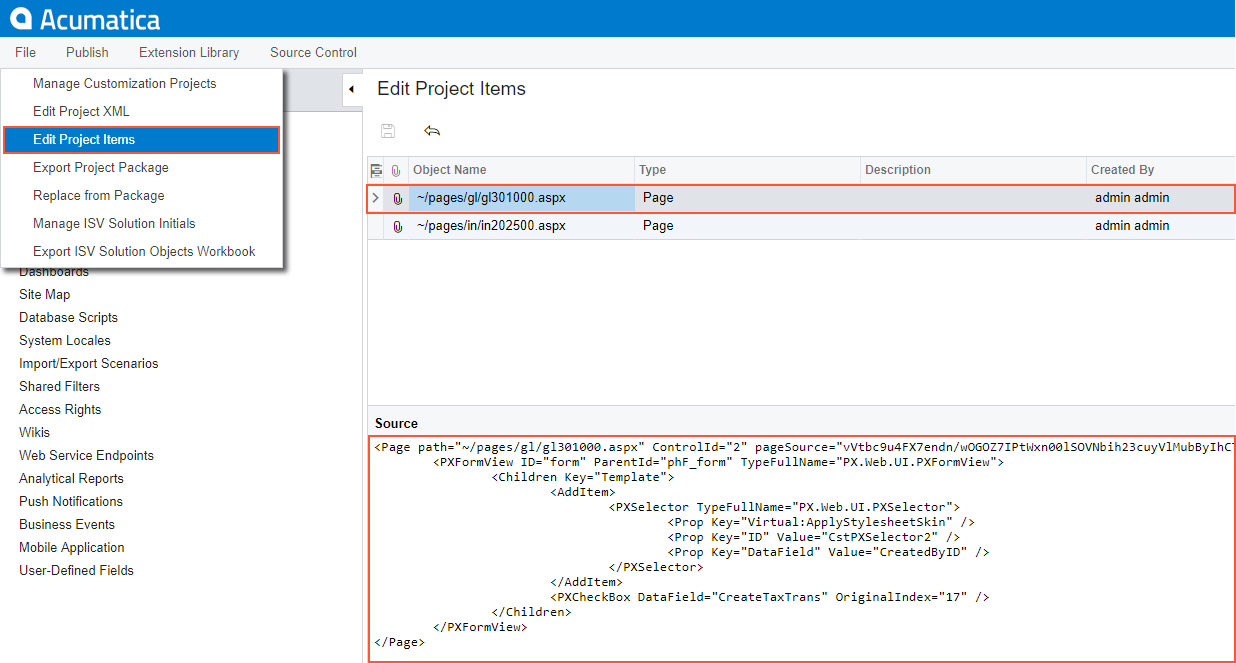 item that contains the .aspx code changeset.Figure 5. Analyzing the added content of the customization project
