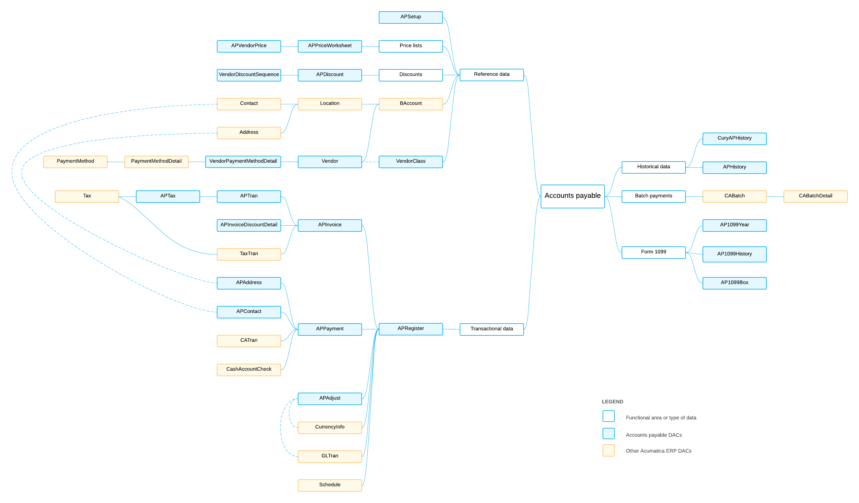 The system uses the accounts payable data access classes (DACs) to enter, monitor, maintain, and process the payments, invoices, and memos that the organization sends to its vendors. For details about the AP processes, see Accounts Payable.