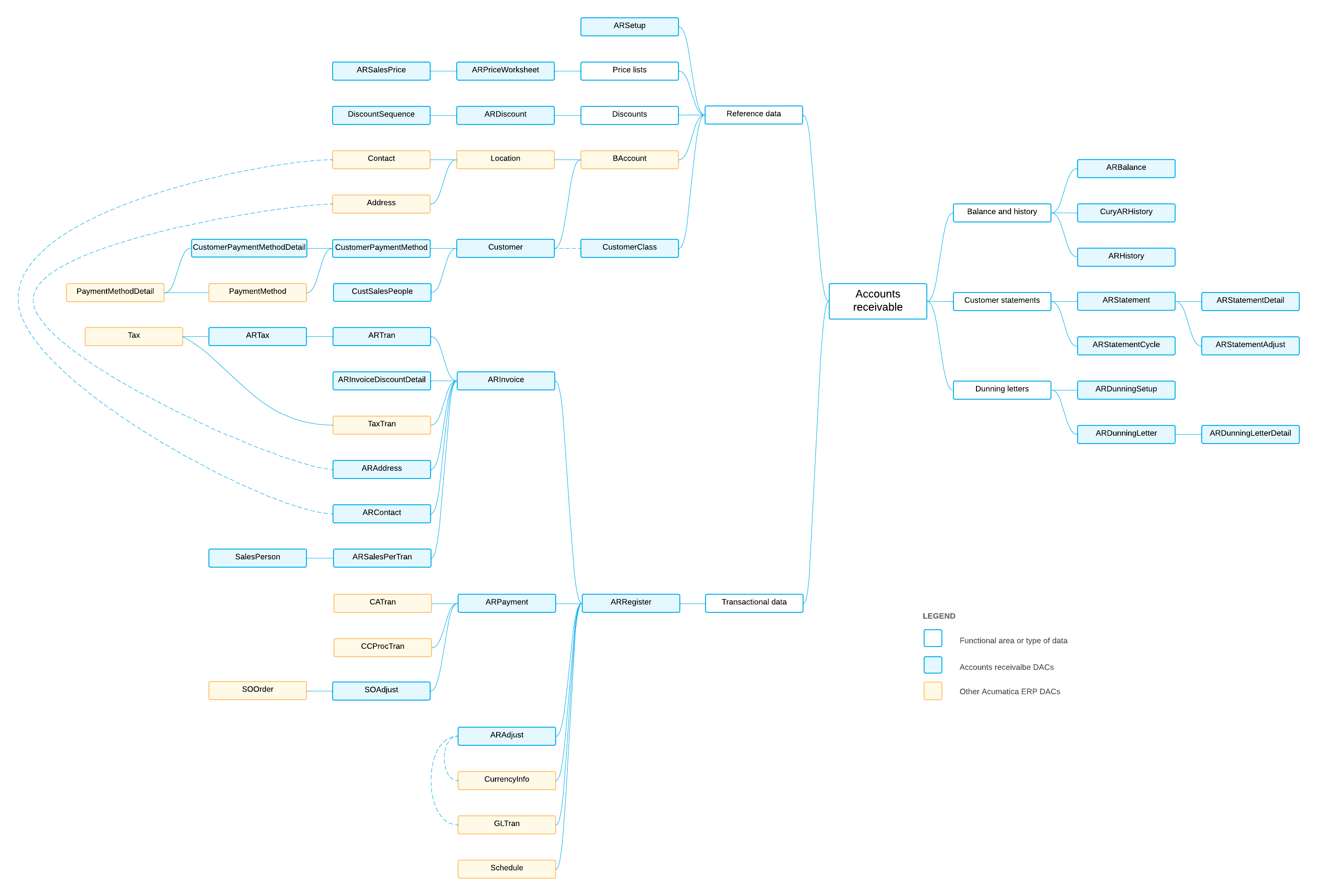 The following diagram illustrates the main relationships between the accounts receivable DACs.