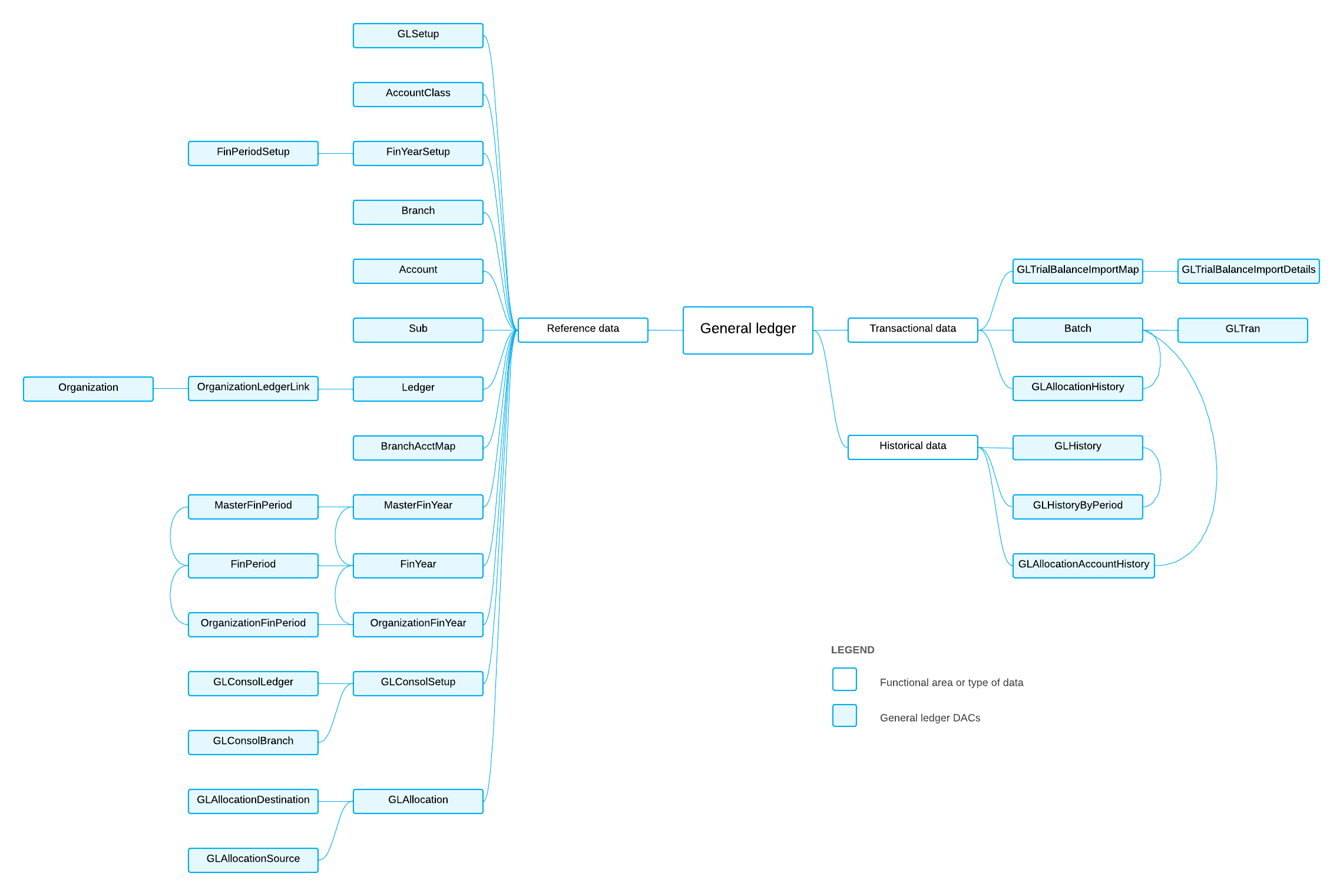 The following diagram shows the basic general ledger DACs and the relationships between them. For detailed descriptions of the DACs and DAC fields, look for the needed DAC in the DAC Schema Browser. (For details about the DAC Schema Browser, see Data from Multiple Data Sources: DAC Schema Browser.)