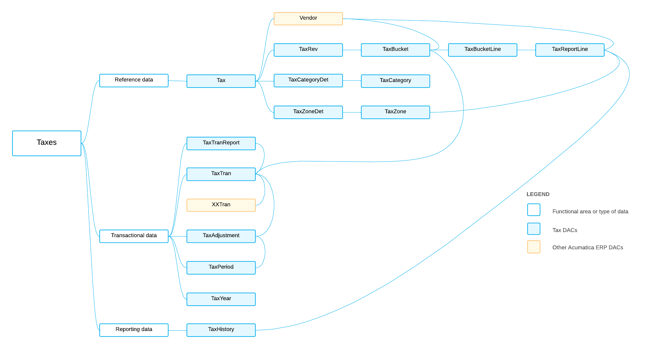 The following diagram shows basic relationships between tax DACs. For detailed descriptions of DACs and DAC fields, look for the needed DAC in the DAC Schema Browser. (For details about the DAC Schema Browser, see Data from Multiple Data Sources: DAC Schema Browser.)