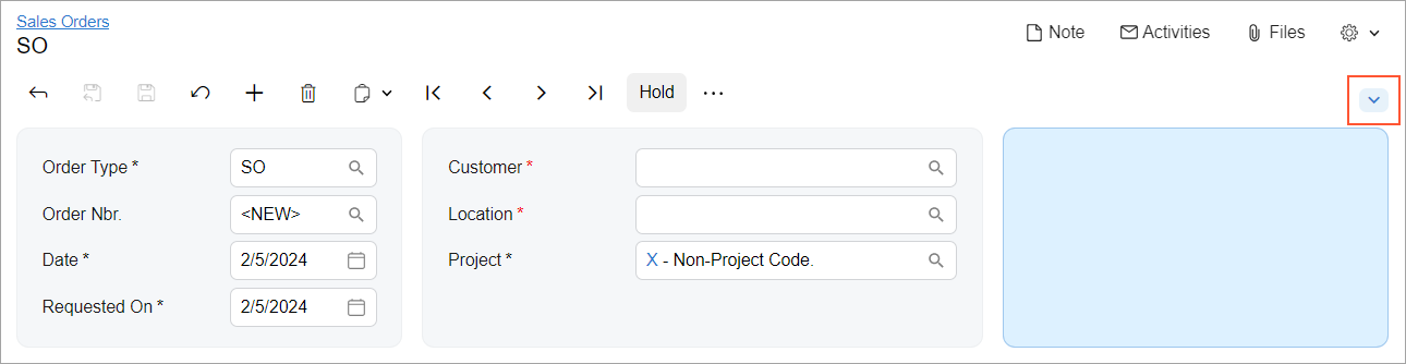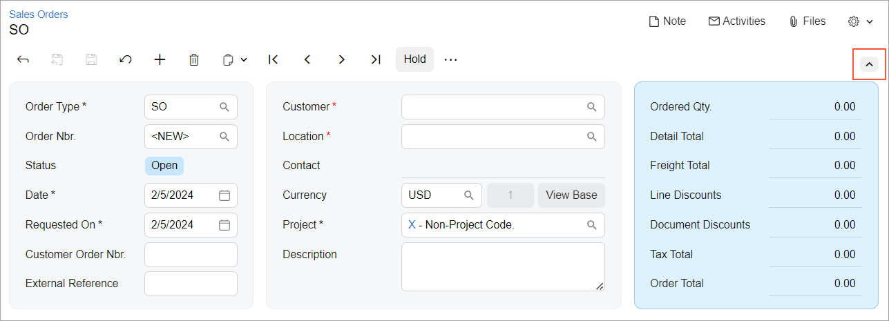 If the form has any collapsible areas, the arrow button is displayed at the top right corner of the form, as shown in the following screenshot.