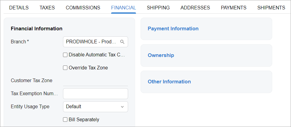 If the section is displayed on a tab and it has no pinned elements, only the title of the section is displayed without the space normally used by its elements, as shown with the sections on the right side of the form in the following screenshot.