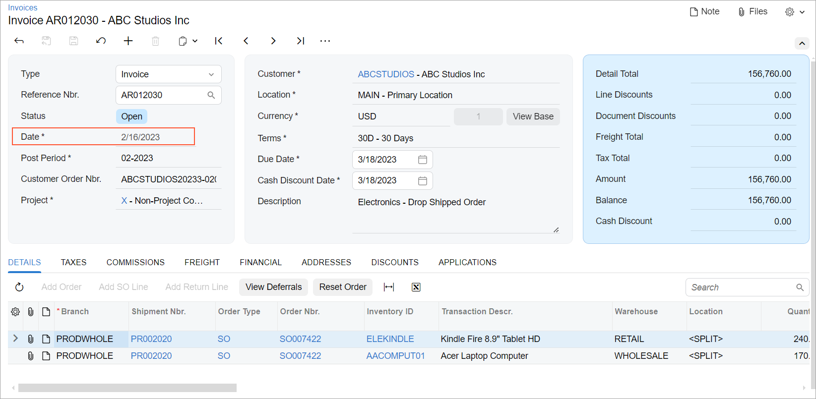 The Date box on the Invoices (SO303000) form, which is shown in the following screenshot![]() |