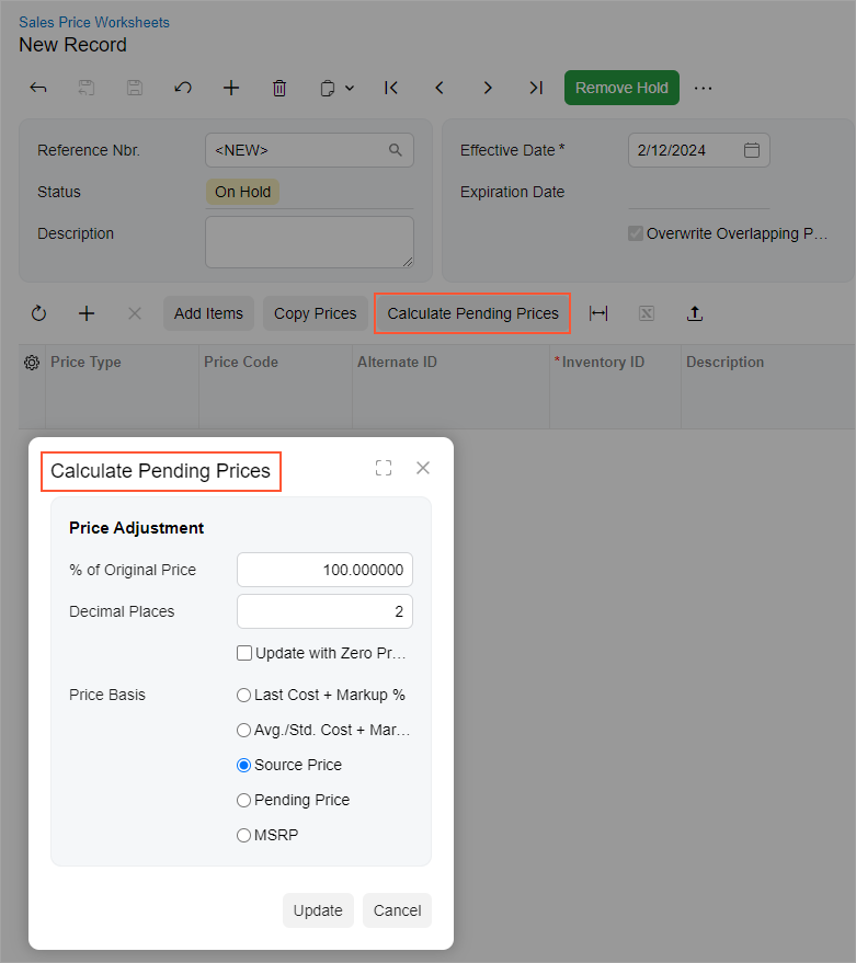 Sales Price Worksheets (AR202010) form, the following dialog box