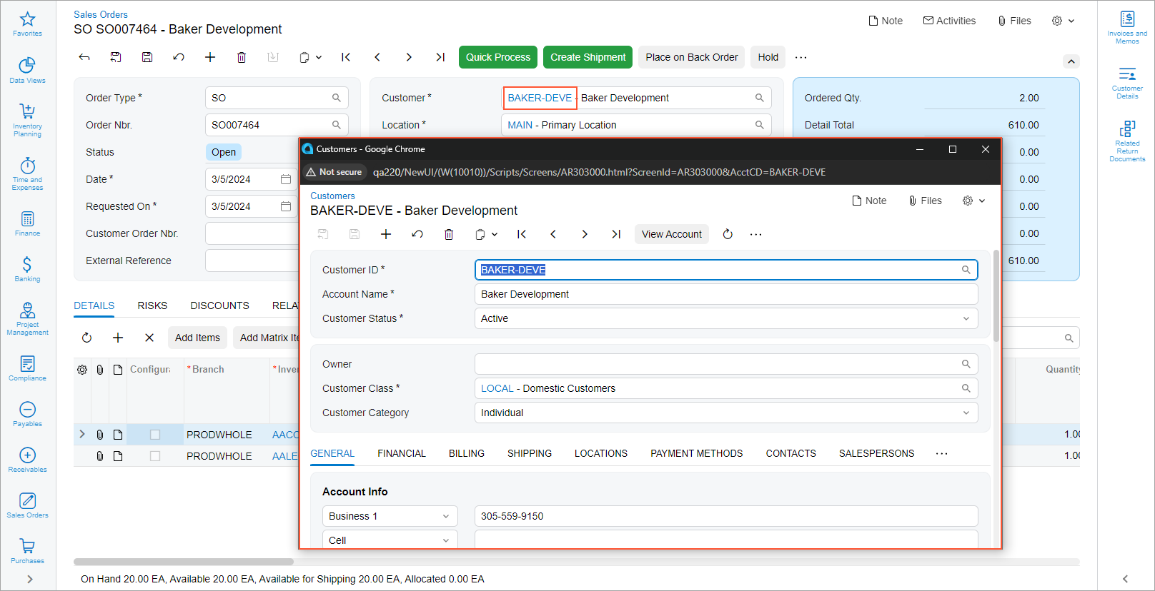 The system launches a pop-up window and displays the selected record on the Customers (AR303000) form. Notice that the original name of