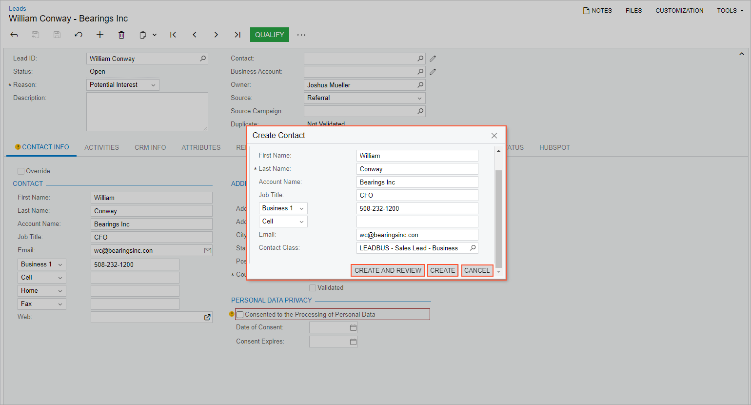 of the Leads (CR301000) form, the dialog box should