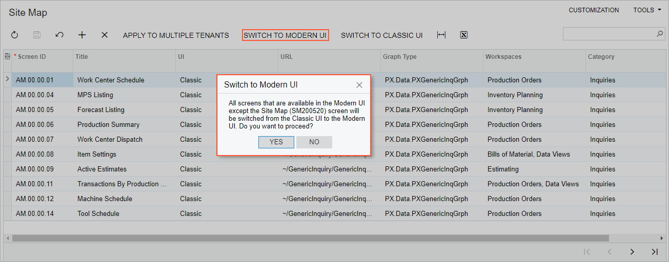 | Dialog box used to confirm an action that the user has invoked by clicking a button or command: Use the button or command name (or a part of it) as the name of the dialog box caption. | When a user clicks the Switch to Modern UI button on the Site Map (SM200520) form, the dialog box shown below opens.