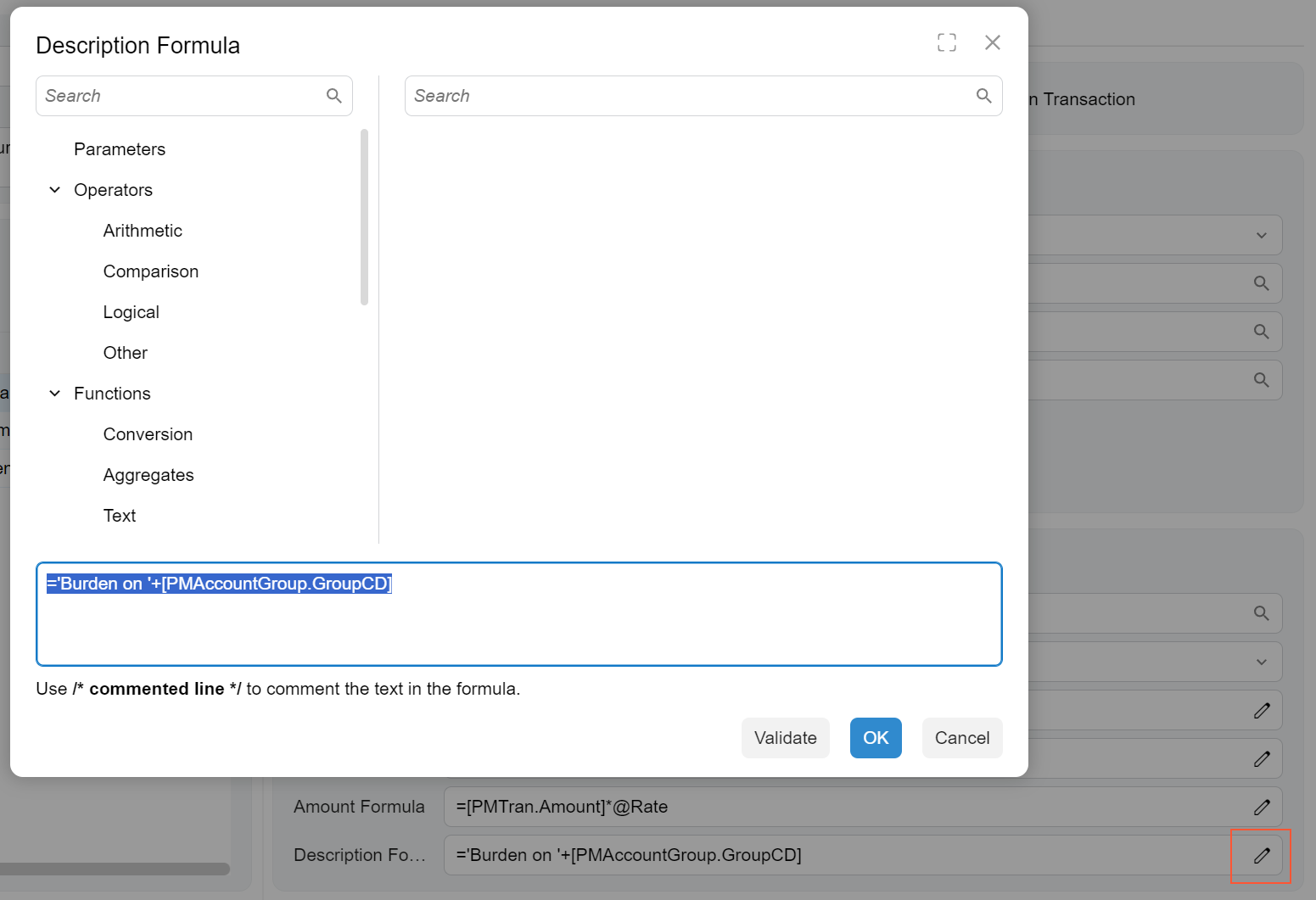 A Formula Editor dialog box is a dialog box where a user can compose a formula. The dialog box (see the following screenshot) opens when a user clicks the Edit button in a formula box.