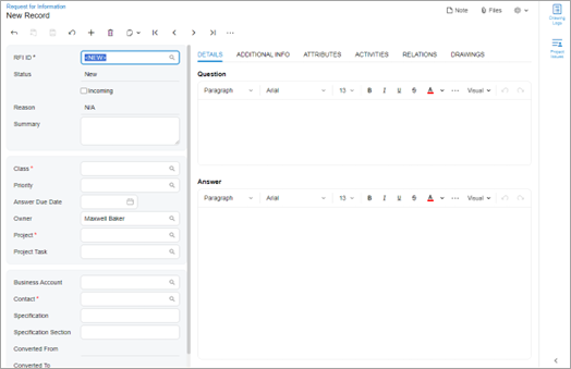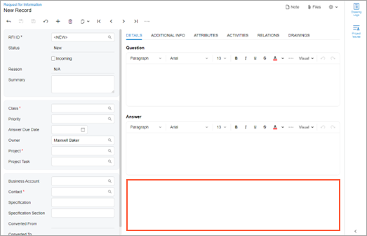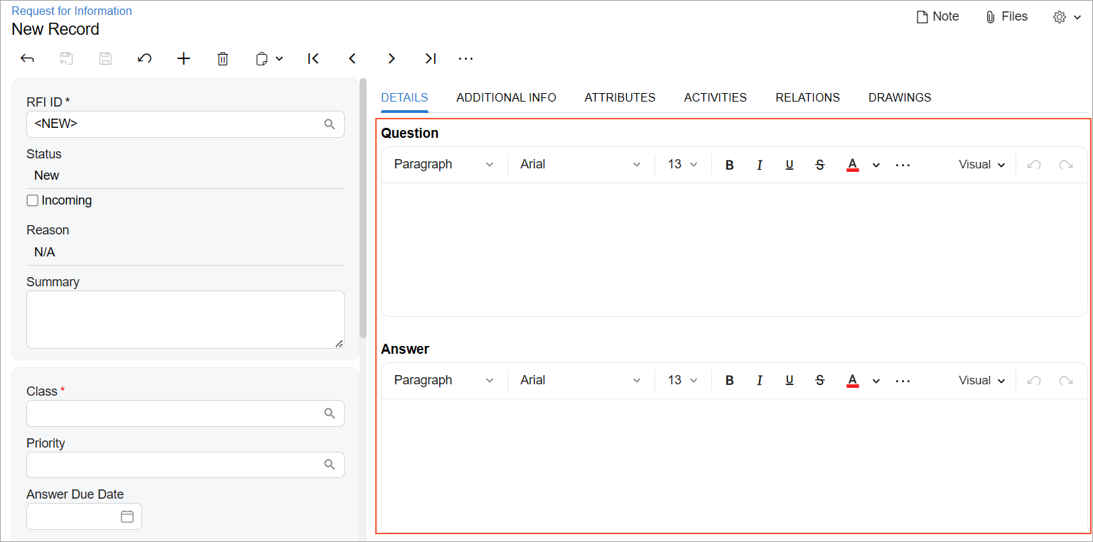 editors on the Details tab of the Request for Information (PJ301000) form, which is shown in the following