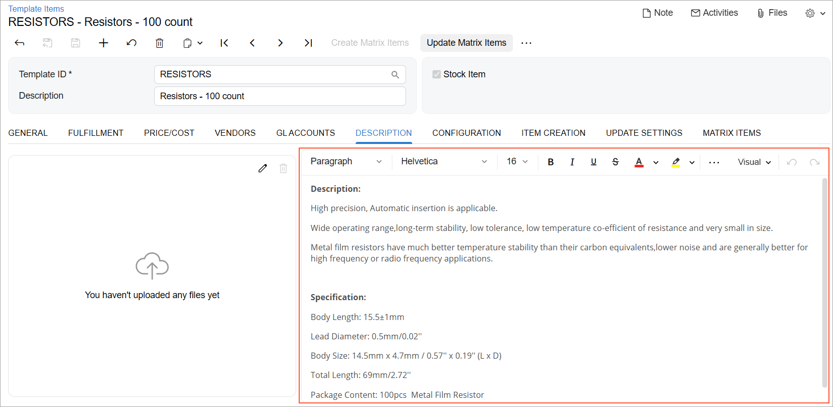 | If the contents of the rich text editor are clearly described by the container in which it is located, do not specify any name for the rich text editor. | The rich text editor on the Description tab of the Template Items (IN203000) form, which is shown in the following