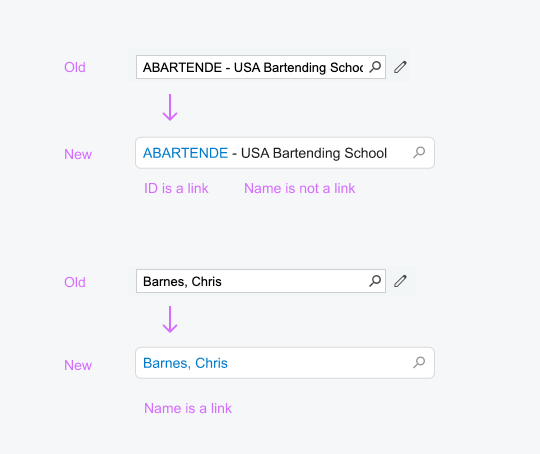 The new selector control does not have the Edit button, which gave users of the Classic UI the ability to open the selected record for editing. Instead, in the Modern UI, the selector control displays a link to the selected record. A user clicks the link to open the record in a new window. For details on configuring a link in the selector control, see Selector Control: Configuration of a Link.