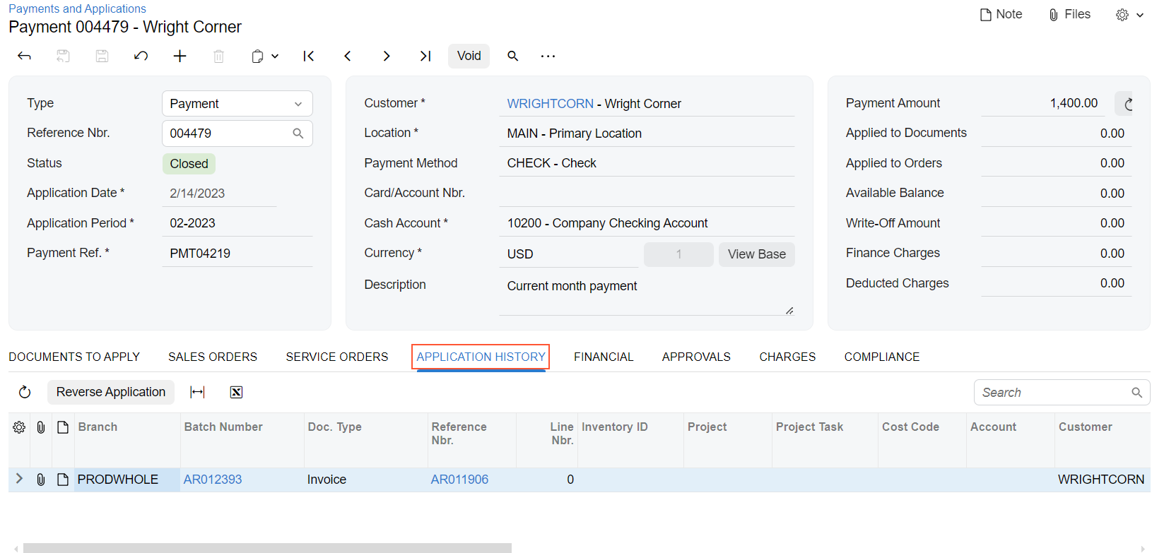 | Use a noun or noun phrase. | The Application History tab on the Payments and Applications (AR302000) form, which is shown in the following