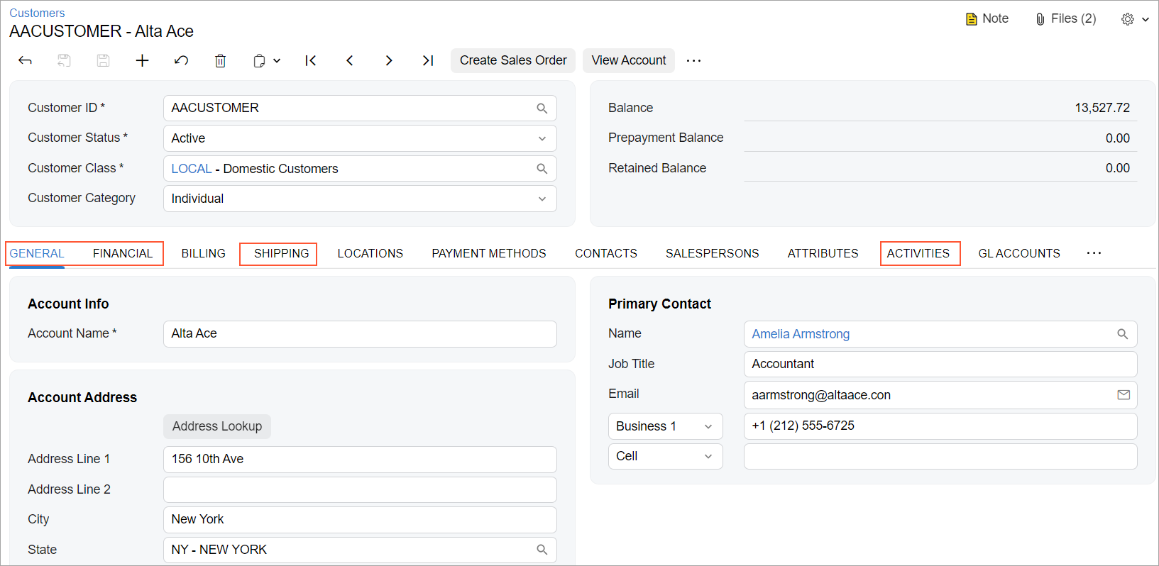 Shipping, and Activities tabs on the Customers (AR303000) form, which are shown in the following