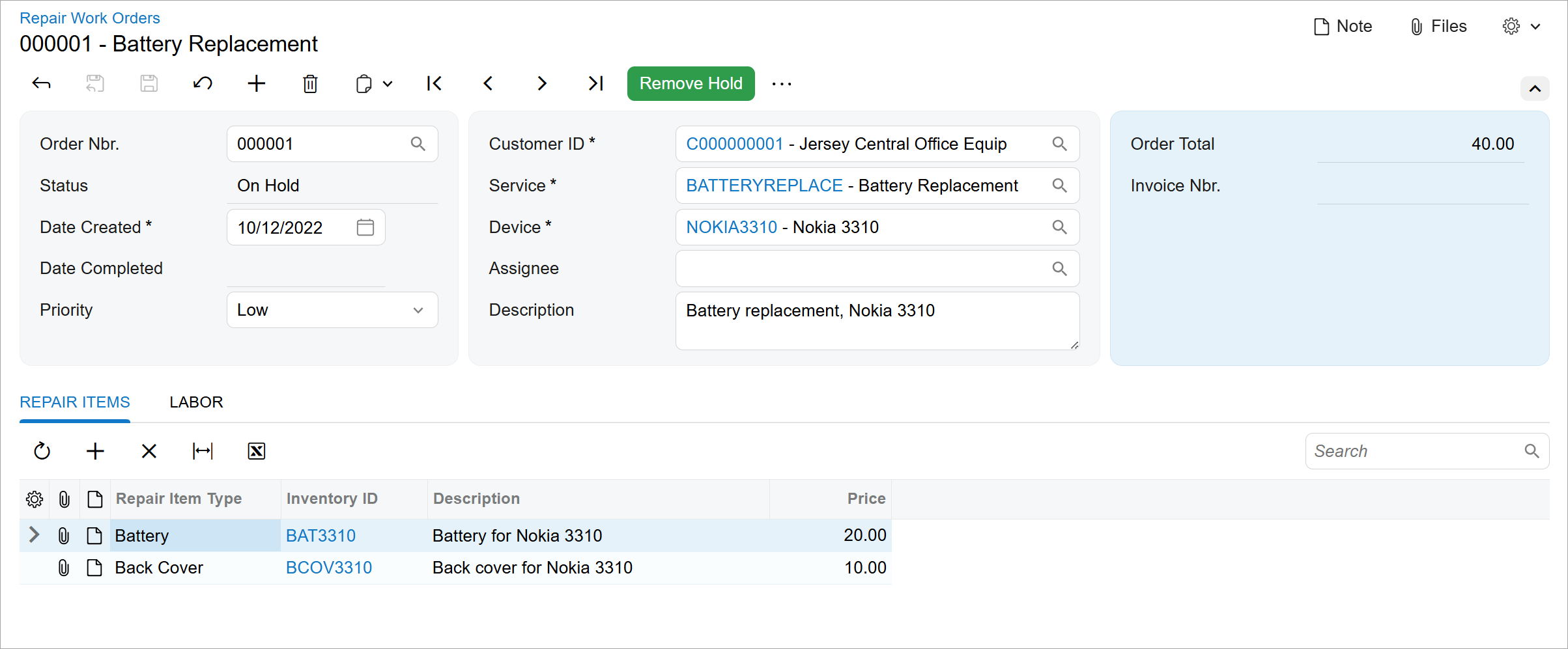 - On the form toolbar, click Remove Hold. Notice that the status of the repair work order has changed to Ready for Assignment.