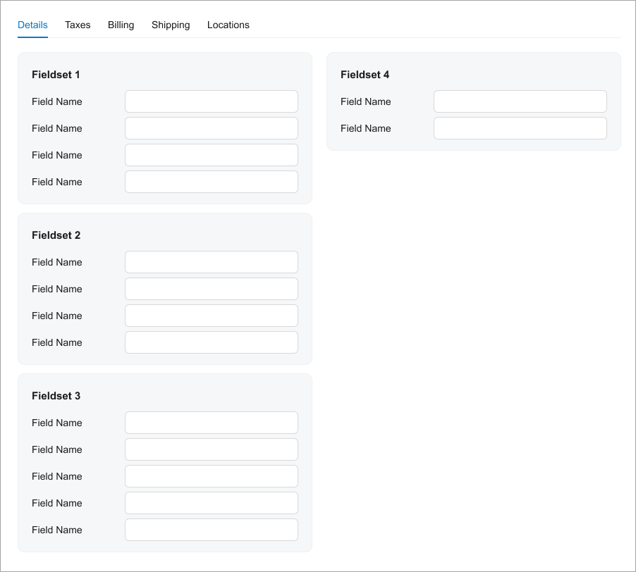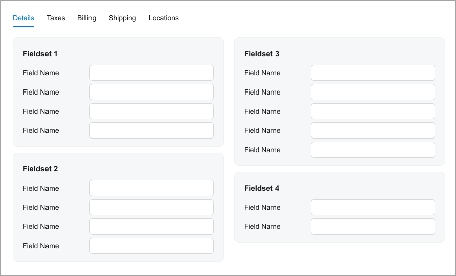 Use a caption instead of showing a single tab. For grids, add the caption as described in Table with a Title. For fieldsets in a qp-template, use the qp-caption control. |