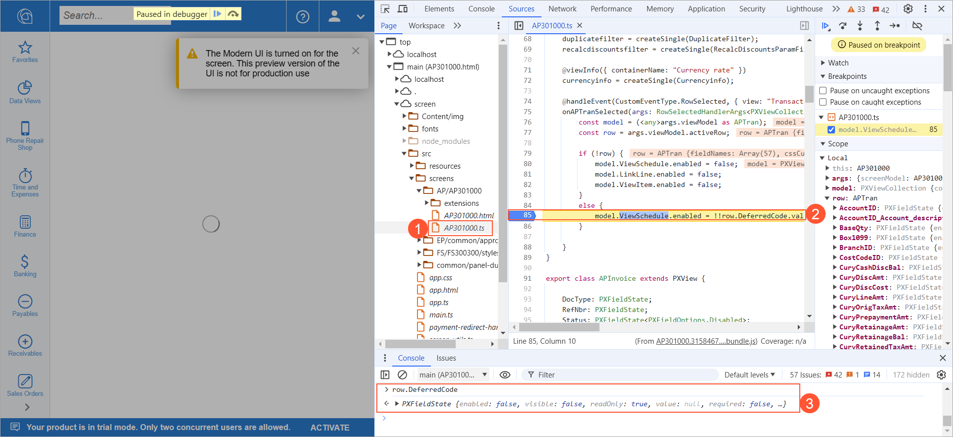 For example, in the following screenshot, the TypeScript code of the Bills and Adjustments (AP301000) form is open, as Item 1 shows. A