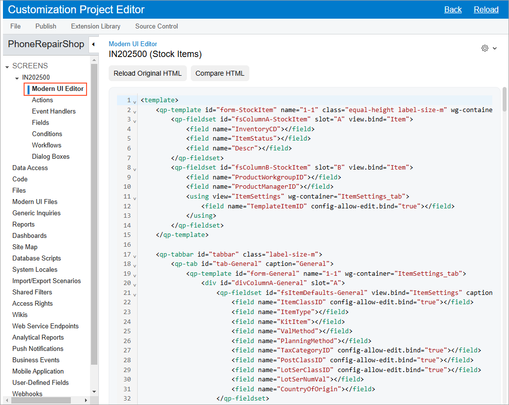 The HTML editor is available on the navigation pane of the Customization Project Editor for each form that you have added to your customization project. To access the editor, on the navigation pane, expand the Screens node. In the list of forms displayed under the expanded Screens node, expand the node that corresponds to the form for which you want to edit the HTML code, and click the Modern UI Editor node. The Modern UI Editor (AU201080) page opens with the HTML editor and displays the current HTML code for the form, as shown in the following screenshot.