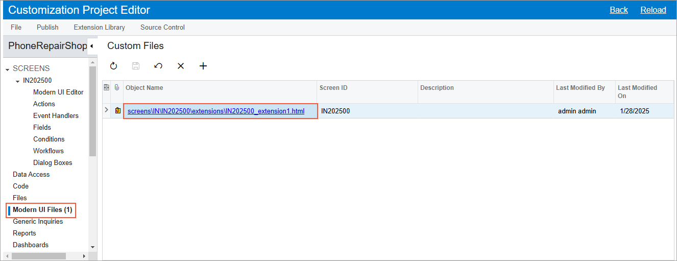 The system generates the extension file (in the specified subfolder in the FrontendSources\screen\src\customizationScreens\<Tenant Name>\screens\<FirstTwoLettersOfFormID>\<FormID>\extensions file path). It also adds this file to the Custom Files (Modern UI) page under the Modern UI Files node, as shown in the following screenshot.