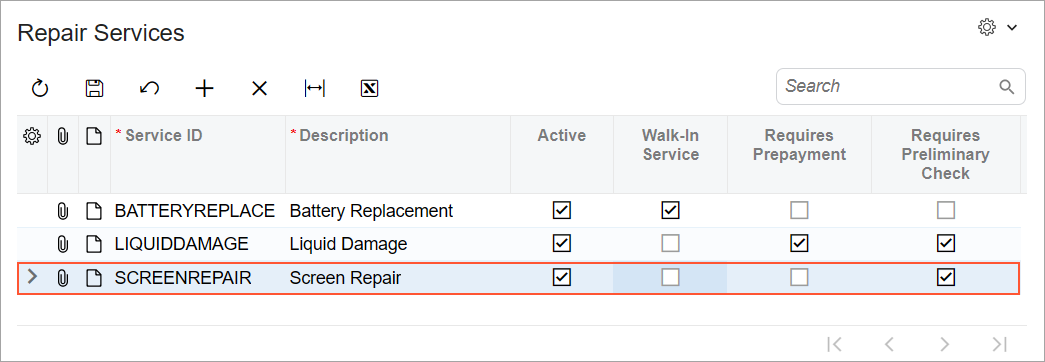 - Select the Walk-In Service check box in the ScreenRepair row.