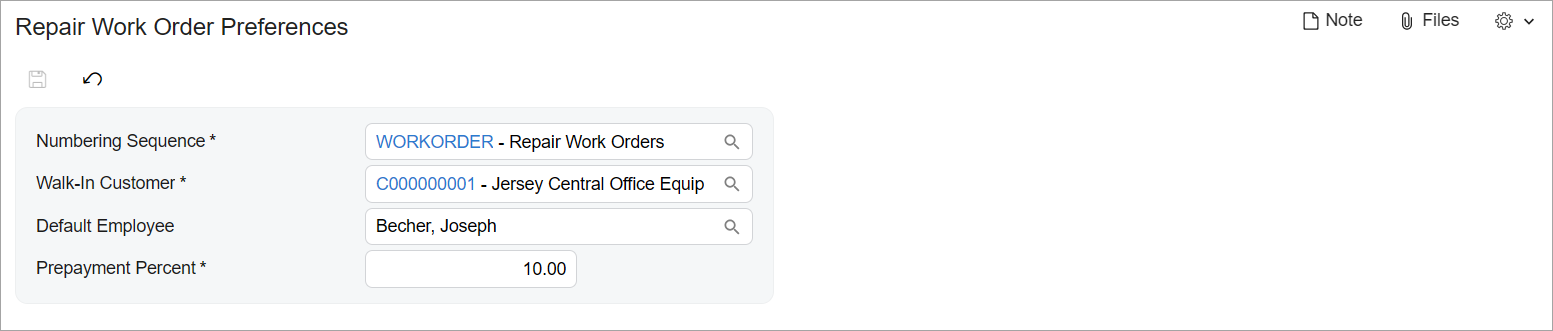 - On the form title bar, click . The Modern UI version of the Repair Work Order Preferences setup form is displayed. The form should look similar to the form shown in the screenshot in the Story section of this activity.