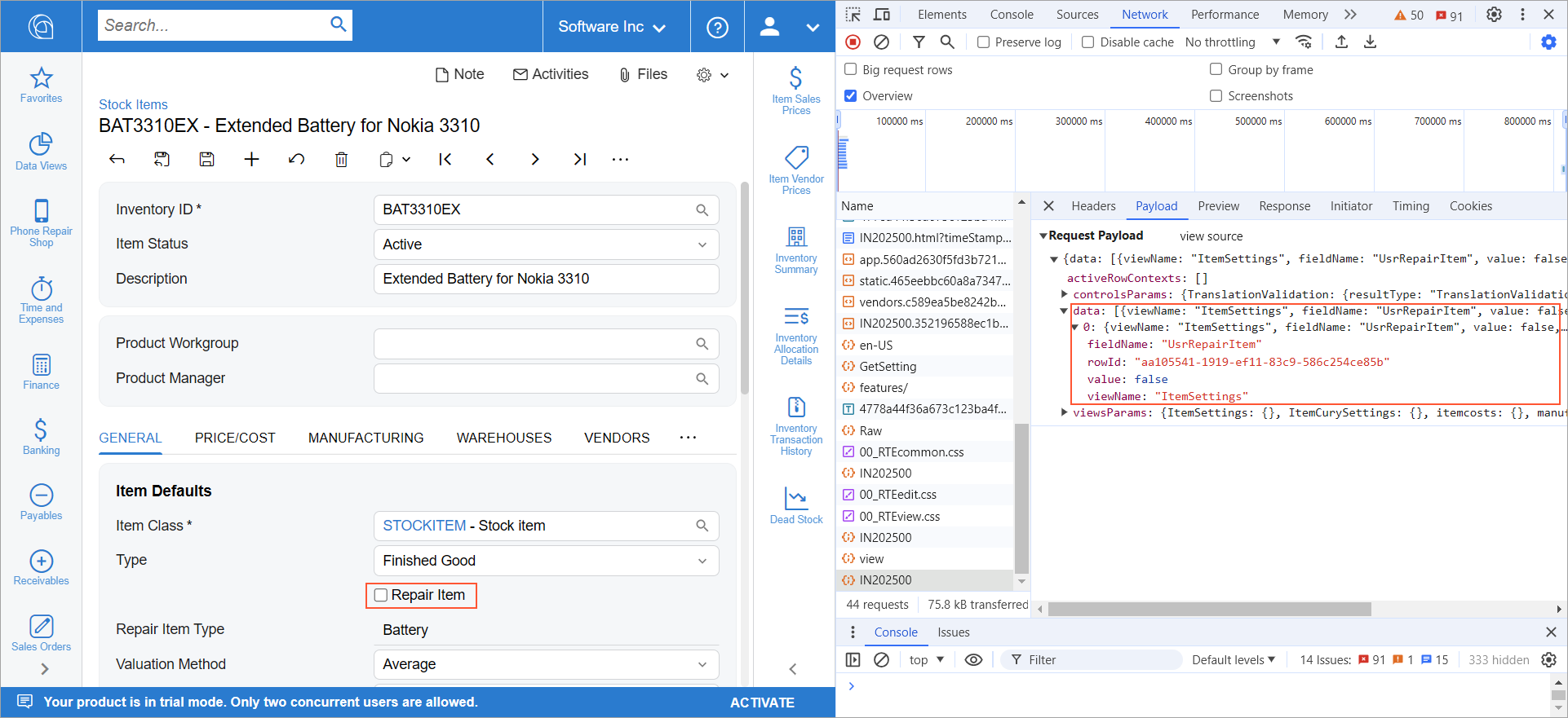 The POST requests with the form ID as the name are not cached. They contain information about the changes made on the form and the responses to these changes from the server. The Payload tab provides information about what has been posted to the server in JSON format. In the data field of the payload, you can see the data changes that has been posted to the server. The server will use this data to update PXCache data. For example, the following screenshot shows the data that is sent when the Repair Item check box is cleared on the form.