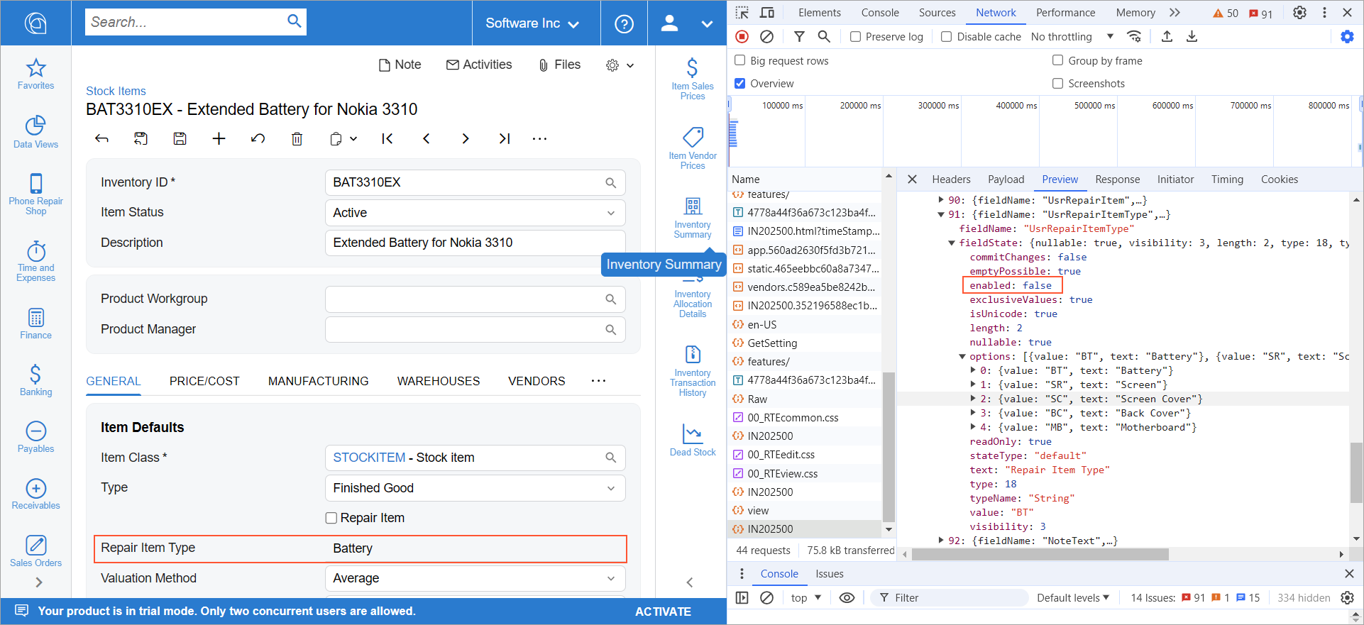 Repair Item Type box is unavailable for editing, as indicated by