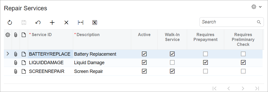 @gridConfig({ preset: GridPreset.Primary }) export class RSSVRepairService extends PXView { ServiceCD : PXFieldState; Description : PXFieldState; Active : PXFieldState; WalkInService : PXFieldState<PXFieldOptions.CommitChanges>; Prepayment : PXFieldState; PreliminaryCheck : PXFieldState<PXFieldOptions.CommitChanges>; }