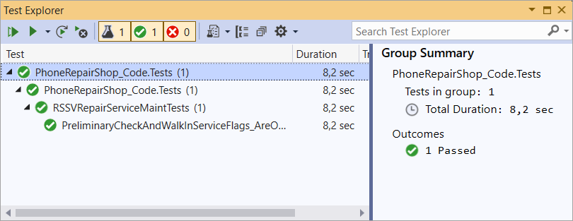 PreliminaryCheckAndWalkInServiceFlags_AreOppositetest method appears in the Test Explorer window (shown in the following screenshot) and is run.Figure 1. The Test Explorer window with one test