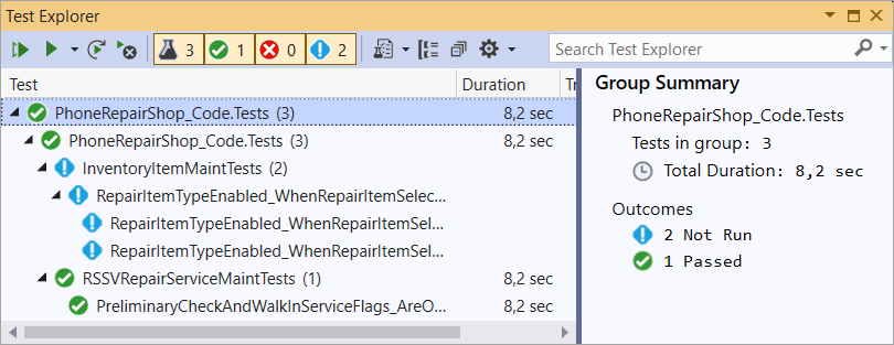 In the Test Explorer window of Visual Studio, you can select the desired test, test method, or group of test methods, and you can run (see Test Method: To Run a Test Method) or debug (see Test Method: To Debug a Test Method) them. You can also get information about the tests' outcomes (whether they have succeeded or not) and execution time.