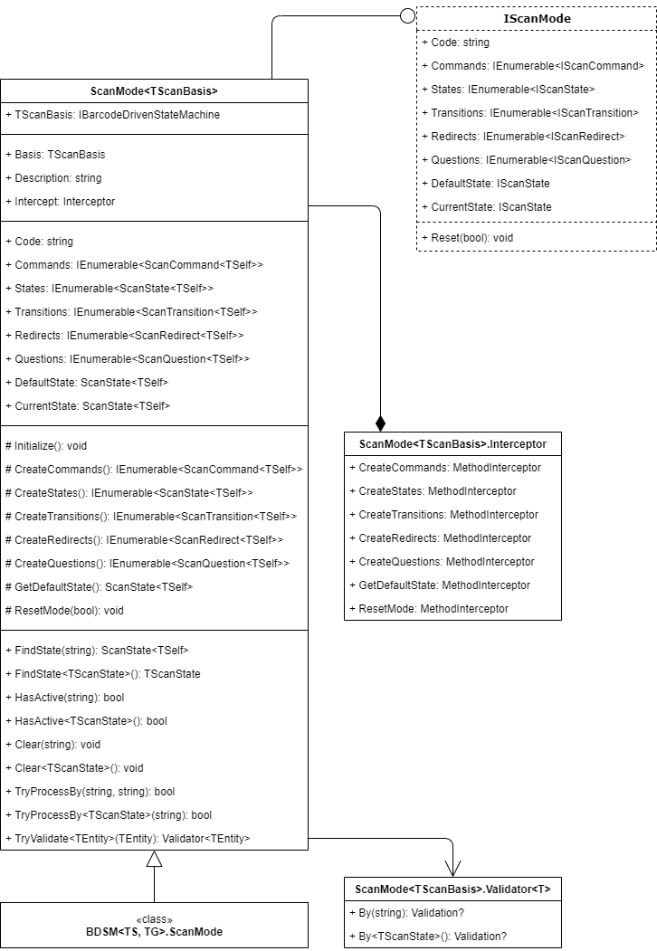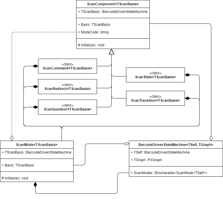 ScanMode<TScanBasis> is the main component of the BarcodeDrivenStateMachine and the base class for all modes. It provides access to all other components and defines their structure and the relationships between them.