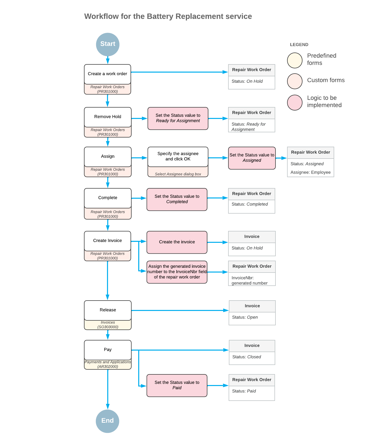 Thus, based on this workflow, a repair work order for the Battery Replacement service will be able to have the following statuses: