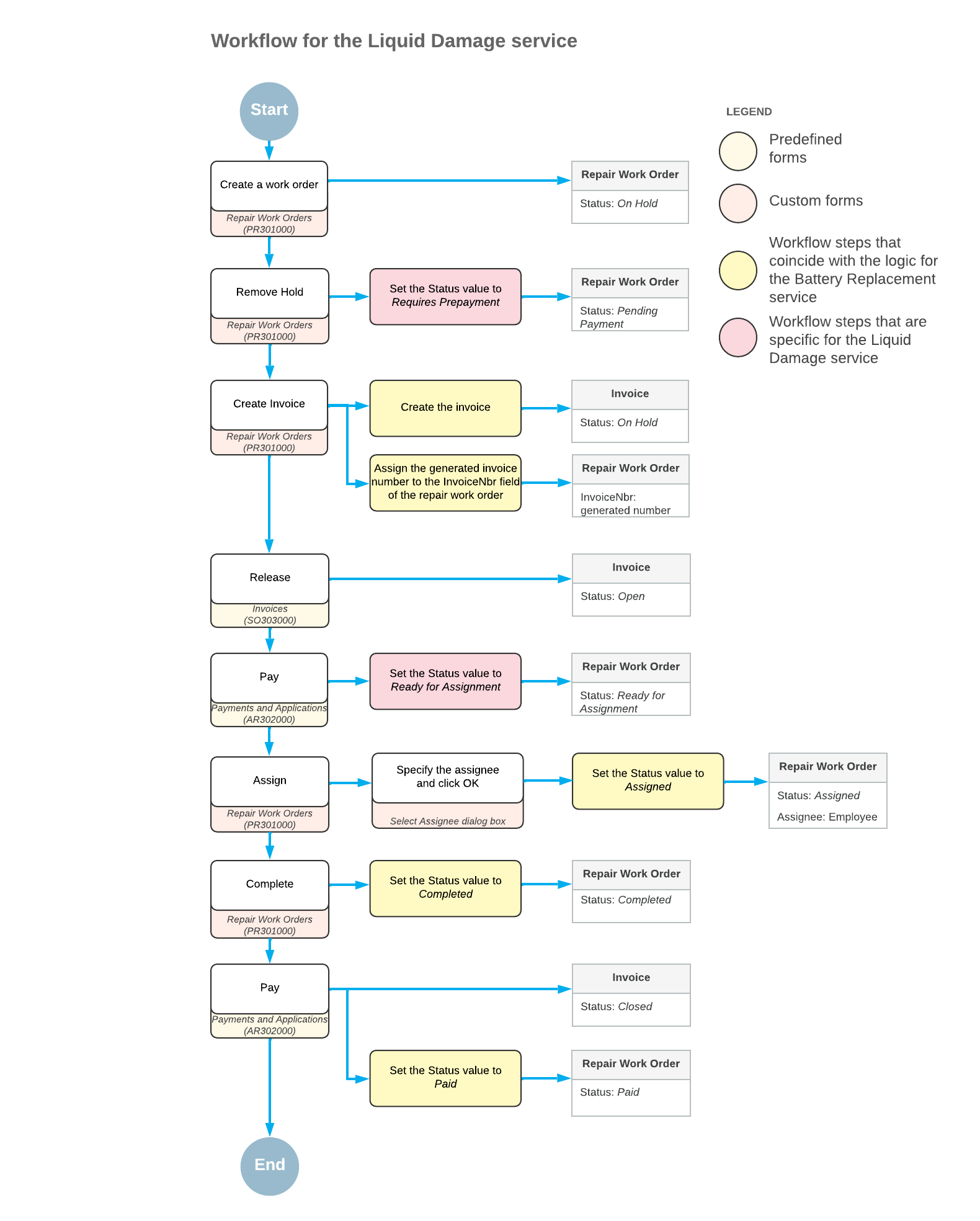 Thus, based on this workflow, a repair work order for the Liquid Damage service will be able to have the following statuses: