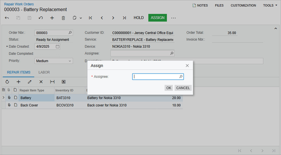 The status of the repair work order changes to Ready for Assignment. The Assign button is displayed on the form toolbar, as shown in the following screenshot.