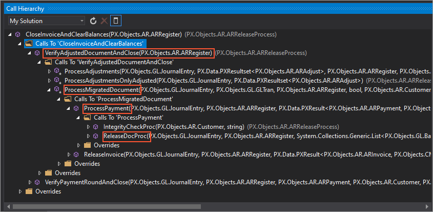 ARReleaseProcess.ProcessPaymentsmethod. You can find theARReleaseProcess.CloseInvoiceAndClearBalancesmethod. The call hierarchy is shown in the following screenshot.Figure 1. The call hierarchy for the CloseInvoiceAndClearBalances method