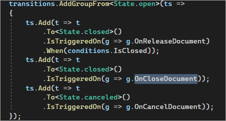 Openstate to theClosedstate. Notice that the transition is triggered by the OnCloseDocument workflow event handler, as shown in the following screenshot.Figure 2. Transitions from the Open state