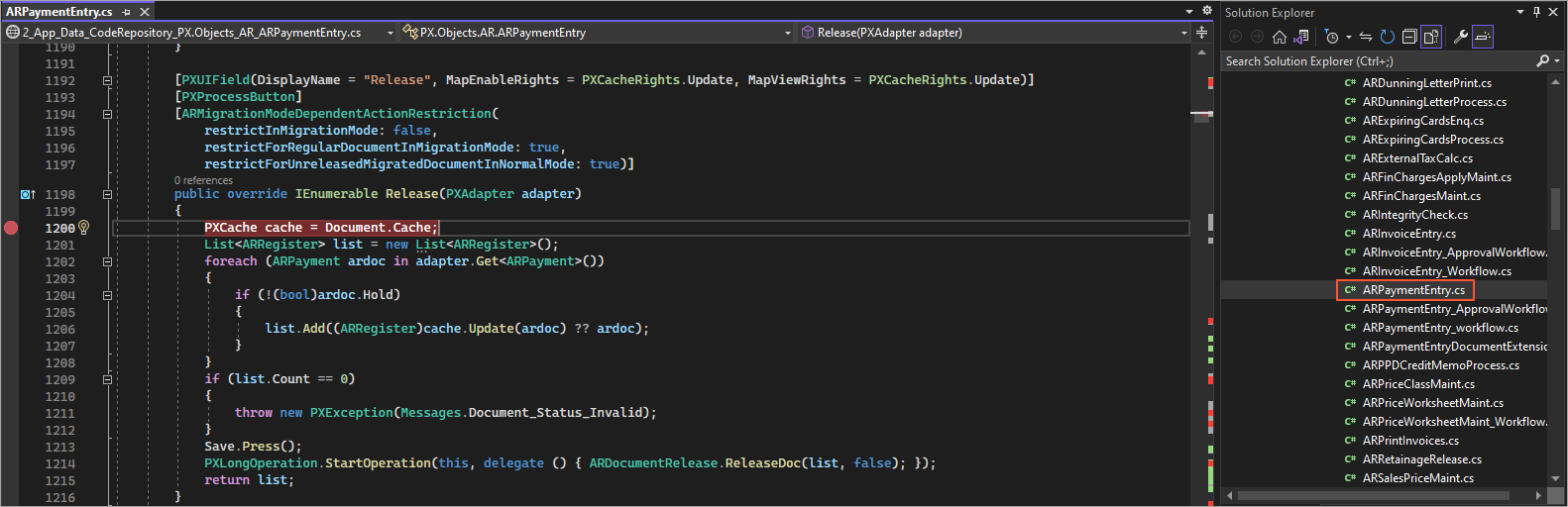 Releaseaction of the Payments and Applications (AR302000) form, open thePX.Objects.AR.ARPaymentEntrygraph: In the website folder in the Solution Explorer, select , and go to the definition of the Release action—that is, theIEnumerable Release(PXAdapter adapter)method. - Add a breakpoint inside the