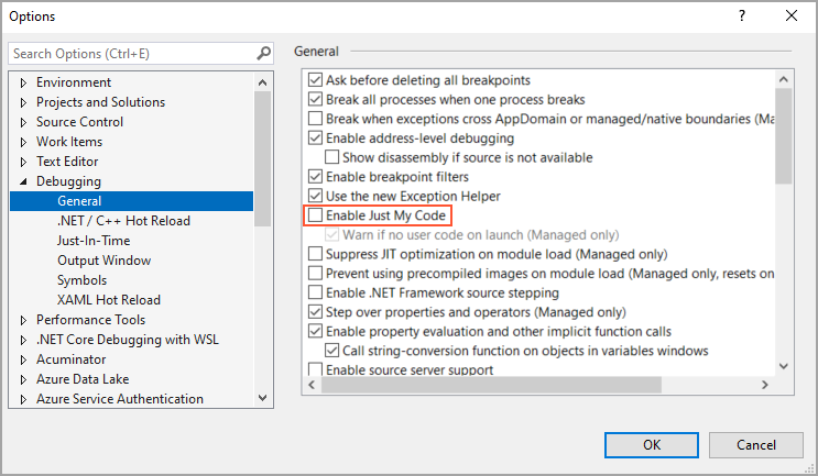 - In the section, clear the Enable Just My Code check box, as shown in the following screenshot.