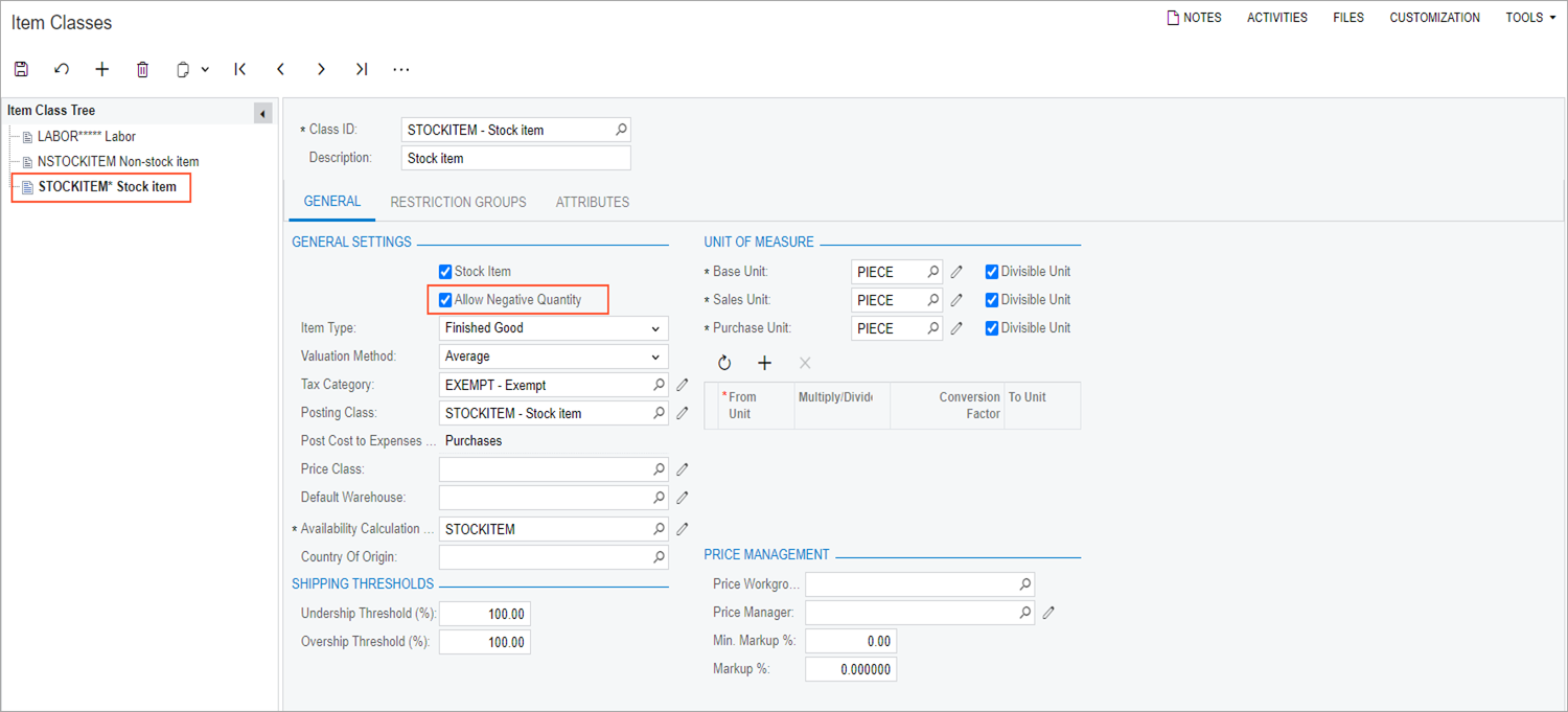 On the Item Classes (IN201000) form, you will also change the STOCKITEM item class to allow negative quantities for the stock items. This will prevent possible issues during the testing of the Create Invoice action.