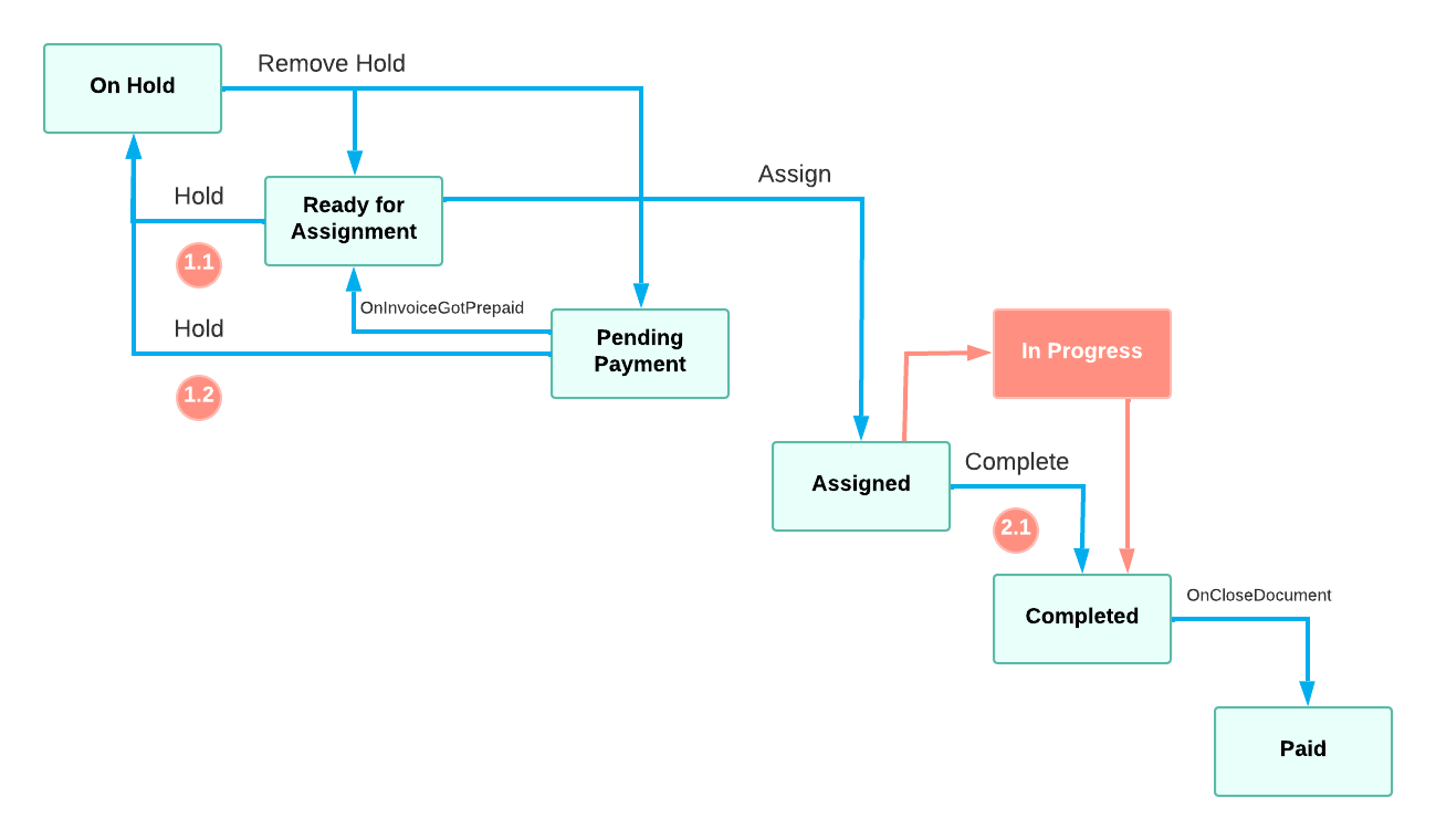 For this value, a new status of the repair work order should be available: In Progress. When a repair work order is in the Assigned status, a user should be able to click Start button and change the status of the order into In Progress. Then, a user should be able to click the Complete button which changes the status of the repair work order into Completed. That means, a new state and two new transitions should be available instead of an old transitions from the Assigned to Completed state (Item 2.1 on the diagram below).