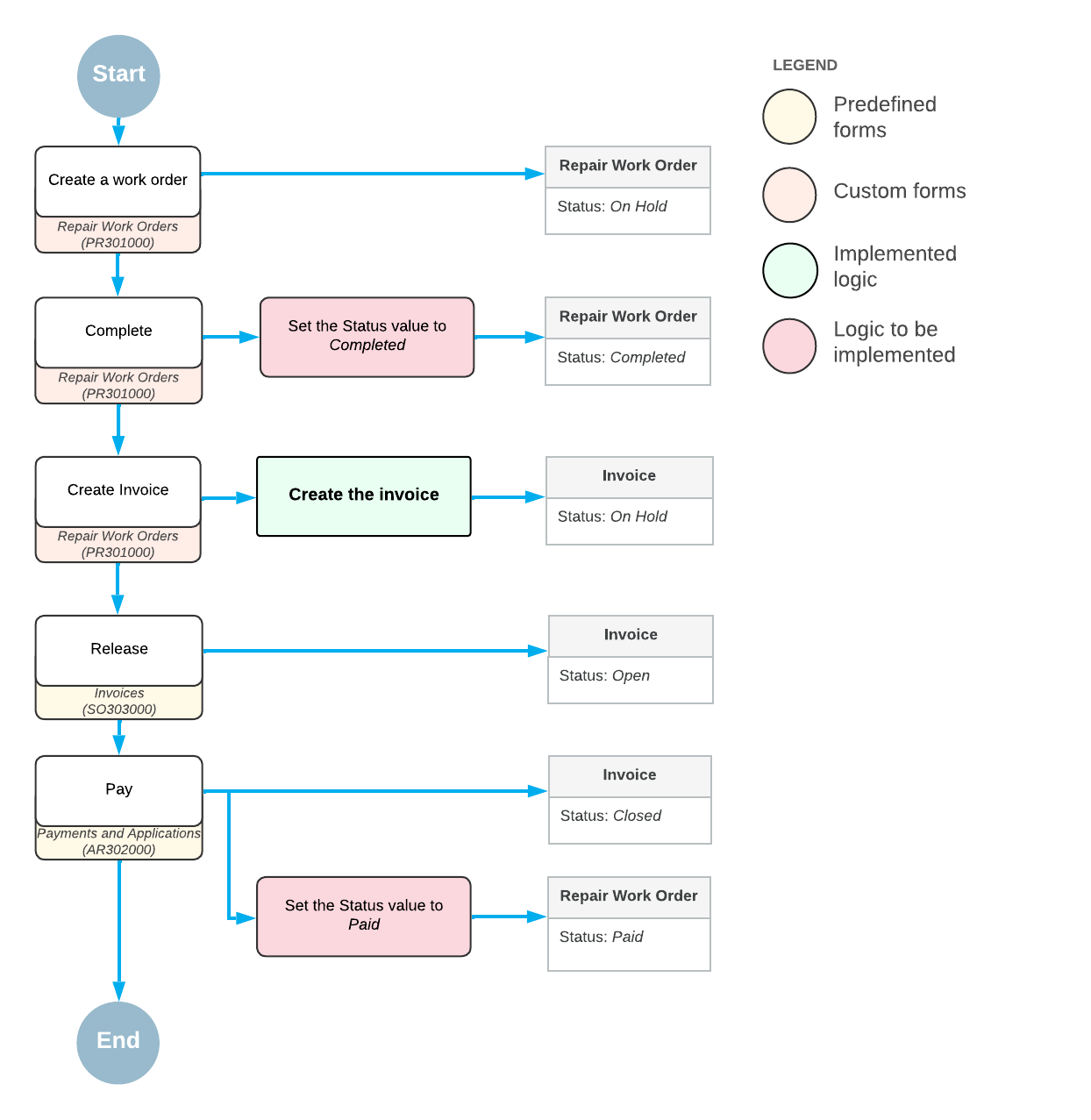 When the repair work order is created, it gets the On Hold status. Then a user can click the Complete action on the form toolbar, which changes the order to Completed. After that, a user can click Create Invoice on the form toolbar, which initiates creation of an invoice for this repair work order. When the invoice is created, a user can release and pay it on the Invoices (SO303000) and Payments and Applications (AR302000) forms respectively. As soon as the invoice is fully paid, the repair work order status should be changed to Paid.
